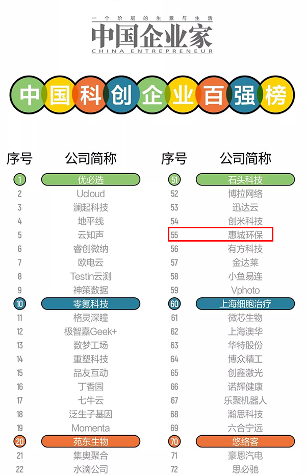 近日,《中國企業(yè)家》發(fā)布“科創(chuàng)企業(yè)百強(qiáng)榜”,我公司青島惠城環(huán)保科技股份有限公司位列其中。